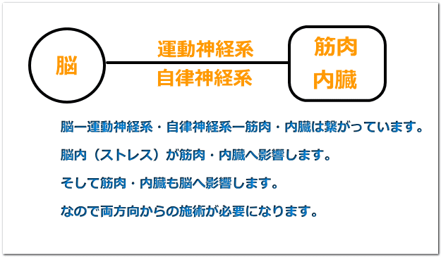 痛みや症状は自律神経のバランスが乱過ぎるとおこります。自律神経の働きはとても重要です。脳=ストレスやある特定の考え方や感情、思考癖が→自律神経の働きを乱します→そして、血流を悪くさせ・筋肉を硬くこらせ→痛みを感じる物質を出します→すると脳で症状として感じたり歪みとしてあらわれます。